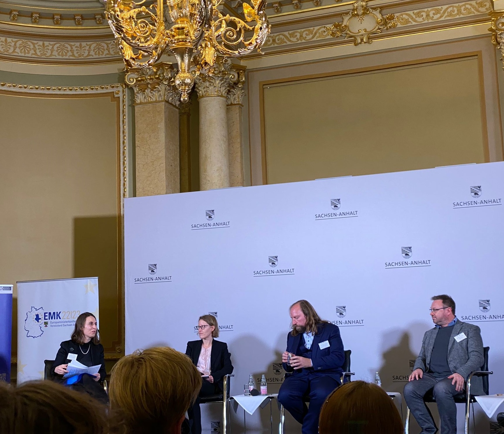The topic this year was the 30th anniversary of the European Ministers Conference (EMC) and the current presidency of the state of Saxony-Anhalt, as well as the publication of a study on the EMC, created by a collaboration of the Jean Monnet Chair and the Hamburg-Vigoni Forums. Rainer Robra (EMF Chair and Minister of European Affairs of Saxony-Anhalt), Dr. Anton Hofreiter (Member of the Bundestag and Head of the Committee on European Union Affairs in the Bundestag), Dr. Johanna Schnabel (Research Fellow at the Otto Suhr Institute of the Free University of Berlin) and Maik Reichel (Director of the Landeszentrale für politische Bildung in Saxony-Anhalt) were invited to participate in the panel discussion. Prof. Dr. Eva Heidbreder moderated the discussion on the potentials of shaping European policy in the Land.
